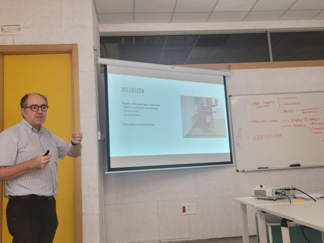 At 1:00 pm, the team converged in the CPCD Workspace at ELDI with Mr. Rafael Hernández Arnaiz to attend a seminar on “Inclusion in Mechanical Engineering Education” by Mr. Manuel Estrems Amestoy, the Director of the Department of Mechanical Engineering, Materials, and Manufacturing at UPCT, who has under his tutelage many students with functional diversities as well as cognitive challenges such as Asperger’s Syndrome, and in whose class these students discover their hidden potential and ability to make a difference in the world of engineering. Described below is the process Mr. Amestoy utilises for inclusive teaching and learning in mechanical and design engineering.